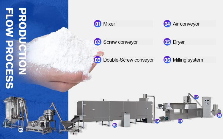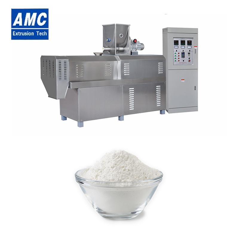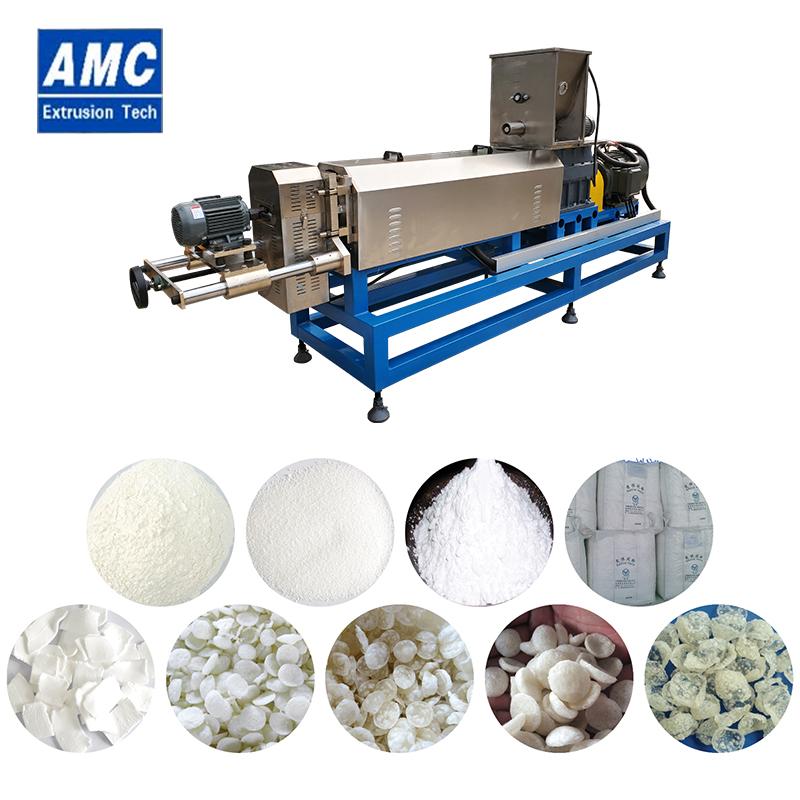 Modified starch extuder machine can produce Denatured Starch, Pre-gelatinized starch is an effective and economical fluid loss agent in water based drilling fluids, which is a starch derivative. It is not bacterial degradation when at 120°C, environmentally acceptable and non-toxic. Modified Starch can produce a thin, slick, tough filter cake and promotes faster penetration rates with reducer friction. It can be used in all kinds of drilling fluid system. Pre-gelatinized starch is also sometimes "pregelatinized" to make them easier to dissolve during product manufacture. Modified starch is widely used in oil drilling, textile, paper and food industries.